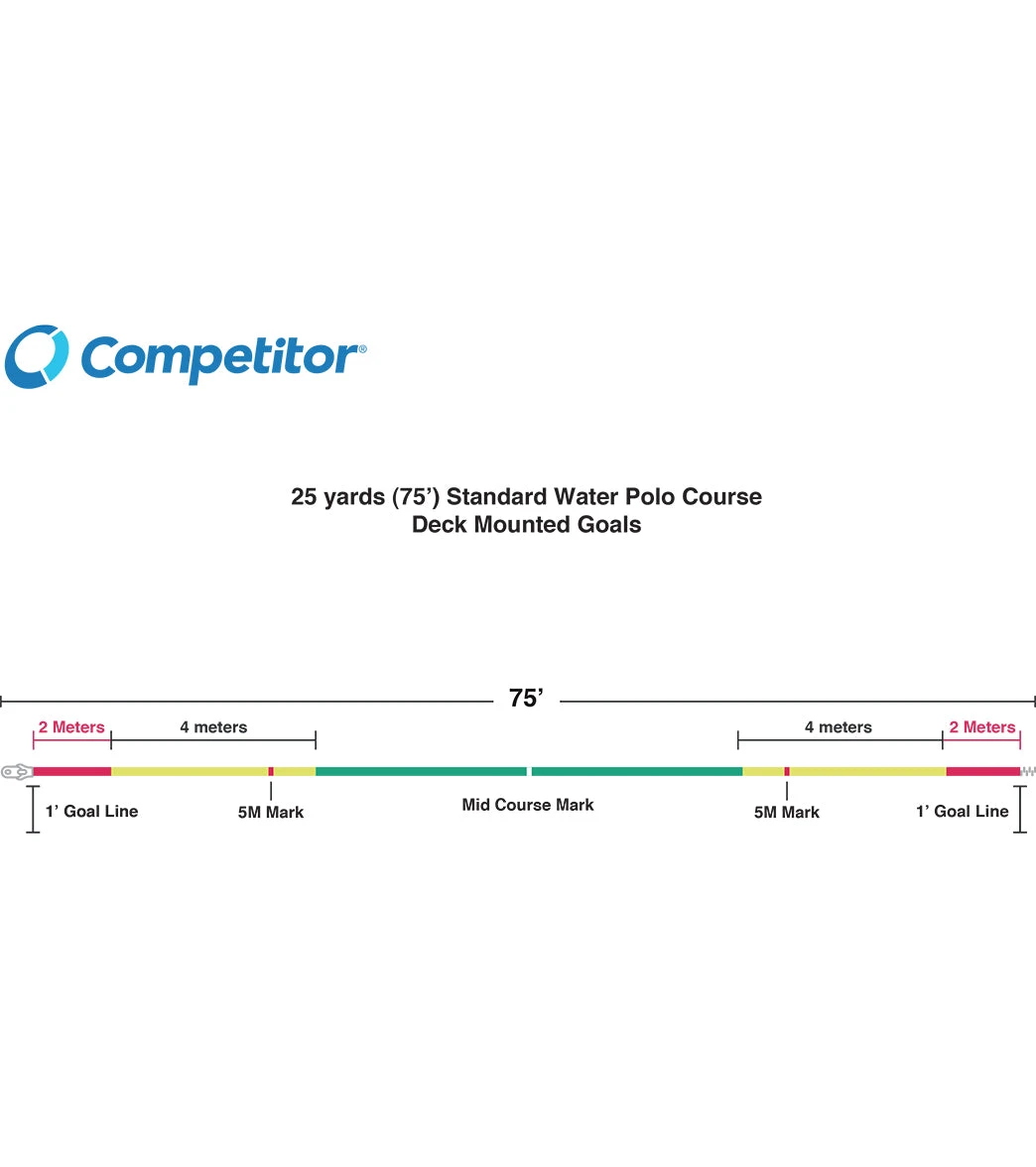 Water polo field of play consists of two sidelines, where the distance between the respective goal lines is 75 feet and 4″ diameter. The sidelines of the field of play from the goal line to the 2 meter line shall be marked in red; from the 2 meter line to the 5 meter line shall be marked in yellow and the middle of the sideline shall be marked in green. There is always a center mark that is white.
